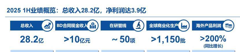 2025年上半年,公司2025上半年实现营收28.195亿元人民币,同比增长2.7%;毛利润约21.992亿元,同比增长10.5%;净利润3.901亿元;经营性现金流超7.709亿元,同比增长206.8%,持续正向流入。业绩期内,公司海外产品利润激增超200%,BD合同现金流入超10亿元,同比增长280%。