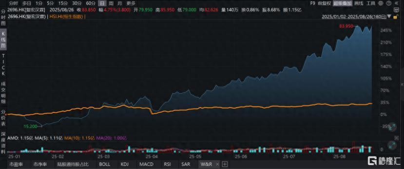 在这股科技浪潮中,创新药板块表现尤为亮眼,迎来属于自己的“DeepSeek时刻”。复宏汉霖(2696.HK)凭借“差异化创新+全球化”双轮驱动,年初至今累计涨幅高达254.43%,市值突破456亿港元(数据截至8月26日),成为市场瞩目的焦点。